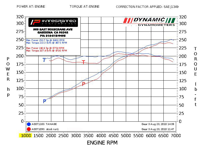 As you all know, we worked on a midpipe for the Lexus IS250/350. These are the results from the dyno of the stock IS350 with only Tanabe's resonated midpipe, bolted to the stock exhaust :